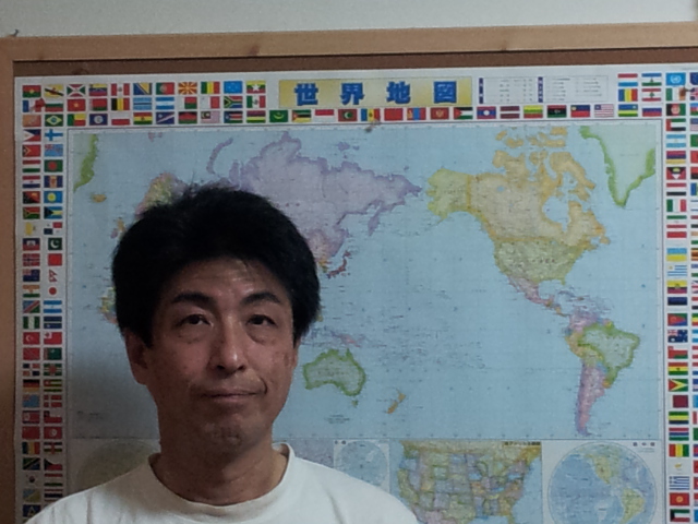 世界地図の前で