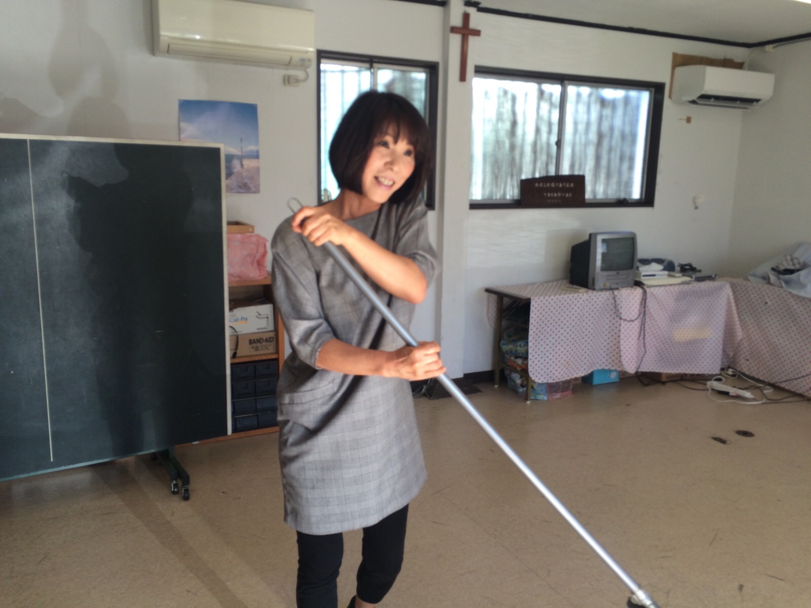 CSのお部屋のお掃除をしています。お掃除してるのかな?遊んでるのかな?レレレのおじさんになってますよ!