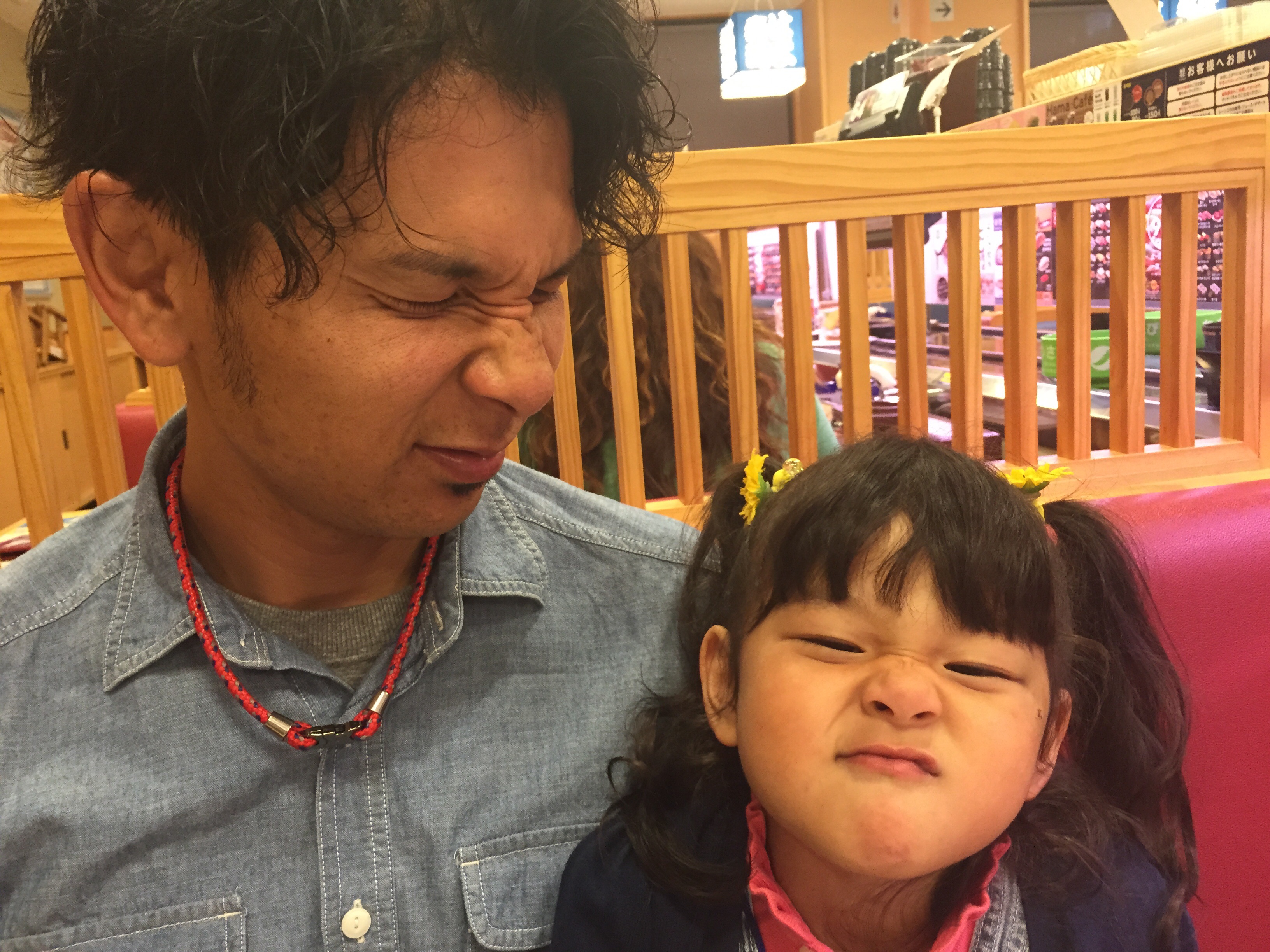 言って、パパのお隣でご飯を食べています♫