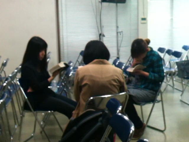 トランペットの由美ちゃん、栗ちゃん、コントラバスの実希ちゃん、練習前にお祈りし聖書を読んでいます。