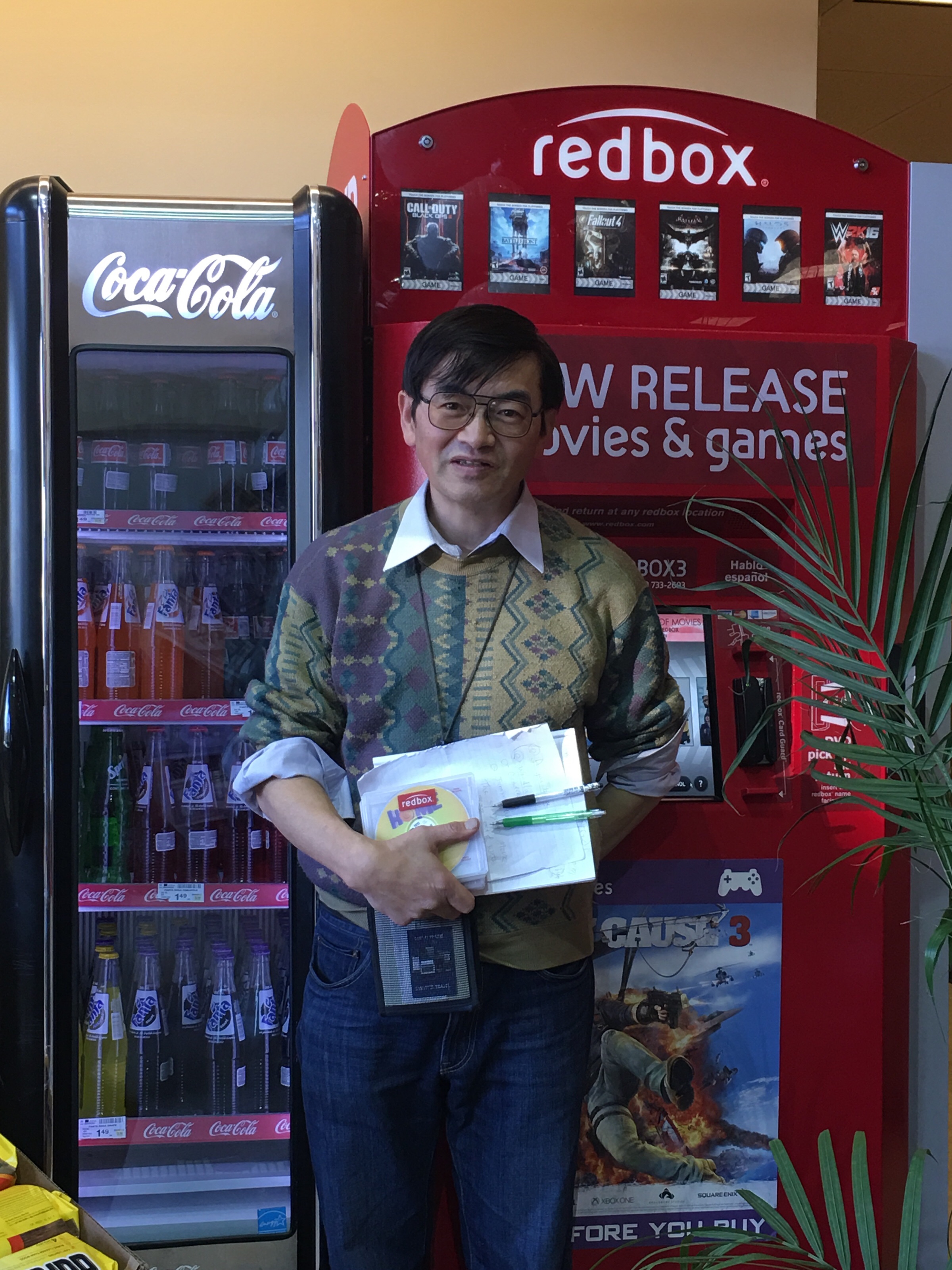 redboxという自動販売機で、DVD1枚1泊で、2ドル位です。p