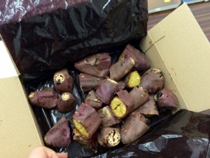 小川さんのGWに実家に帰省したお土産です。茨城の焼き芋です。ウェットで甘くて美味しいです(⌒▽⌒)!