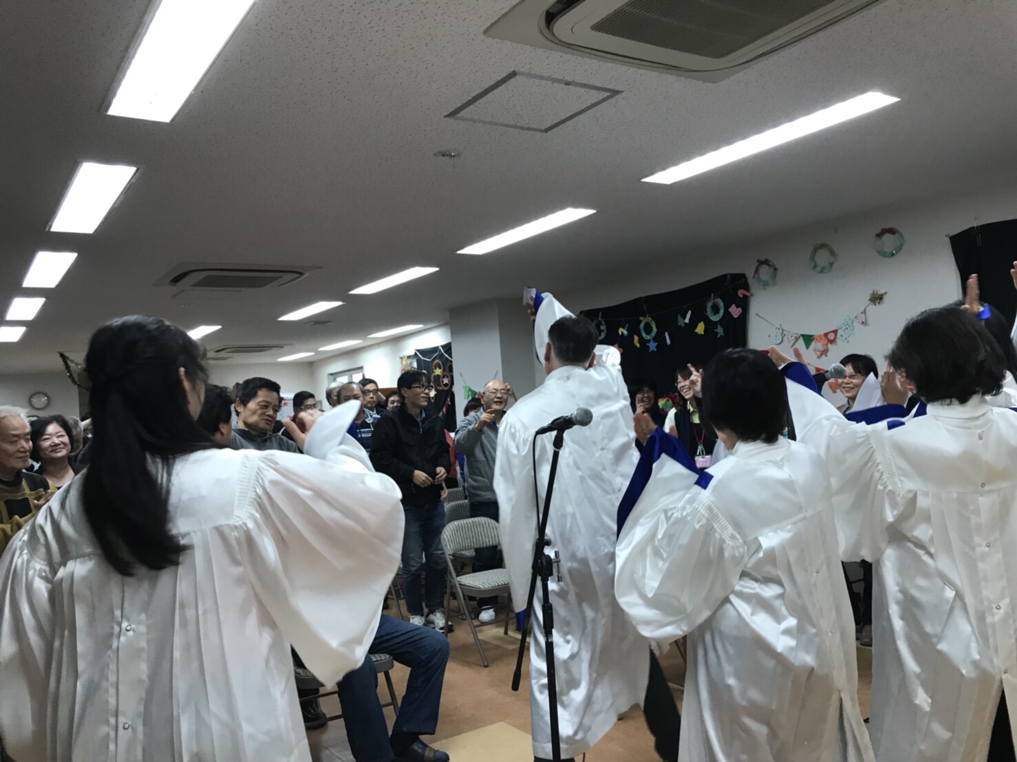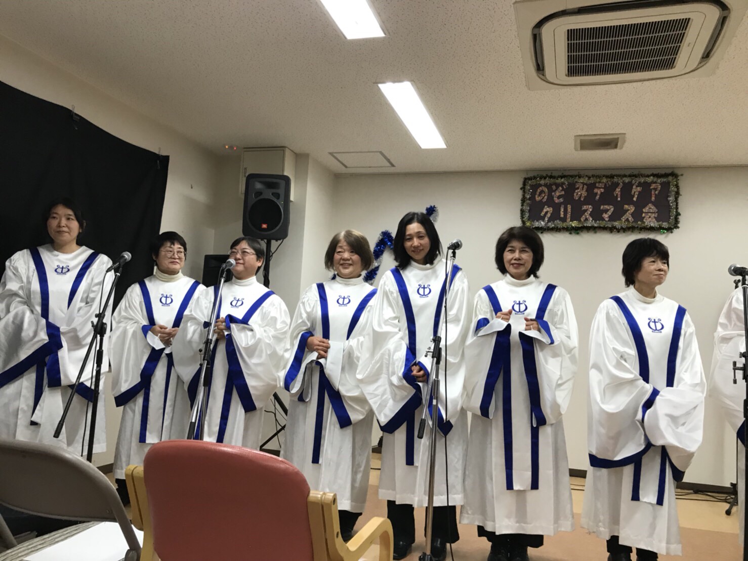 施設の担当者の方がホームページを見て依頼されました。会場となった施設三階のホールにはスタッフの方を含めて約70名ほど方が集まり、サプライズとしてのゴスペルコンサートに利用者の方々からは歓声があがりました。コンサートはクリスマス曲を含めて9曲歌い、特に、永遠の愛の時には泣きながら聞いている方も多くいました。最後のGod is Loveの時にはほとんどの方が立ち上がり、一緒に手拍子とLの字を作り盛り上がりました。