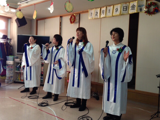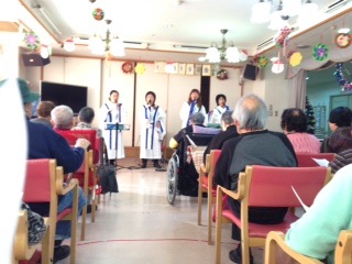 12月19日(金)、大阪Jゴスペルクラブが大阪市東成区にあるデイサービス、サンローズオオサカでボランティアコンサートを行いました。先方がゴスペルクラブのホームページを見て依頼してこられ、今回で2回めの訪問です。会場には、100名ほどの利用者さんが集まりました。最初にクリスマスキャロルを歌い、有名な曲は歌詞カードを配り一緒に歌いました。やすらぎの歌になるとじっと聞き入り、特に「大きな愛」や「永遠の愛」ではウンウンとうなづきながら聞いてくださいました。最後の「God is Love」では手拍子で盛り上がりました。アンコールの声がかかり、退場する時にも「きれいな声で歌ってくれてありがとう。また来てやー。待ってるでぇ。」と言ってくださいました。すべての栄光を主にお返しいたします。